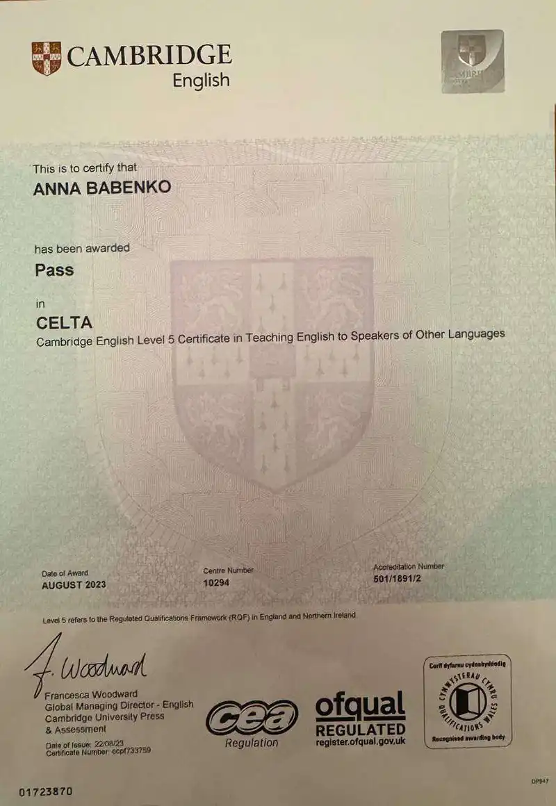 Я можу описати себе як веселого та енергійного викладача англійської мови, і для мене важливо зробити навчання цікавим та захоплюючим. Відвідавши понад 50 країн, я приношу у клас справжню валізу культурних цікавостей і люблю перетворювати навчання у навчальну пригоду – адже чому б освіті не бути веселою і цікавою? Дуже добре вмію поєднувати організаційні навички з умінням знаходити спільну мову зі студентами. На рівні спілкування володію італійською, і обожнюю спілкуватися з людьми з різних культур.