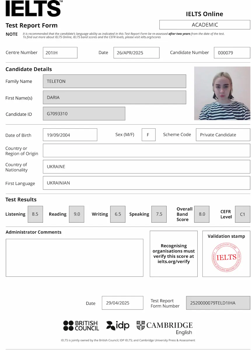 Обожнюю навчати людей і створювати комфортну атмосферу на заняттях, де є місце і для жартів, і для серйозних розмов. Викладаю не лише загальну англійську, а й бізнес-англійську та підготовку до міжнародних іспитів. Найбільше ціную щирість і взаємоповагу під час навчання – саме вони допомагають досягати найкращих результатів. У вільний час люблю малювати та тренуватися в залі, бо енергія й натхнення – найкращі друзі викладача.