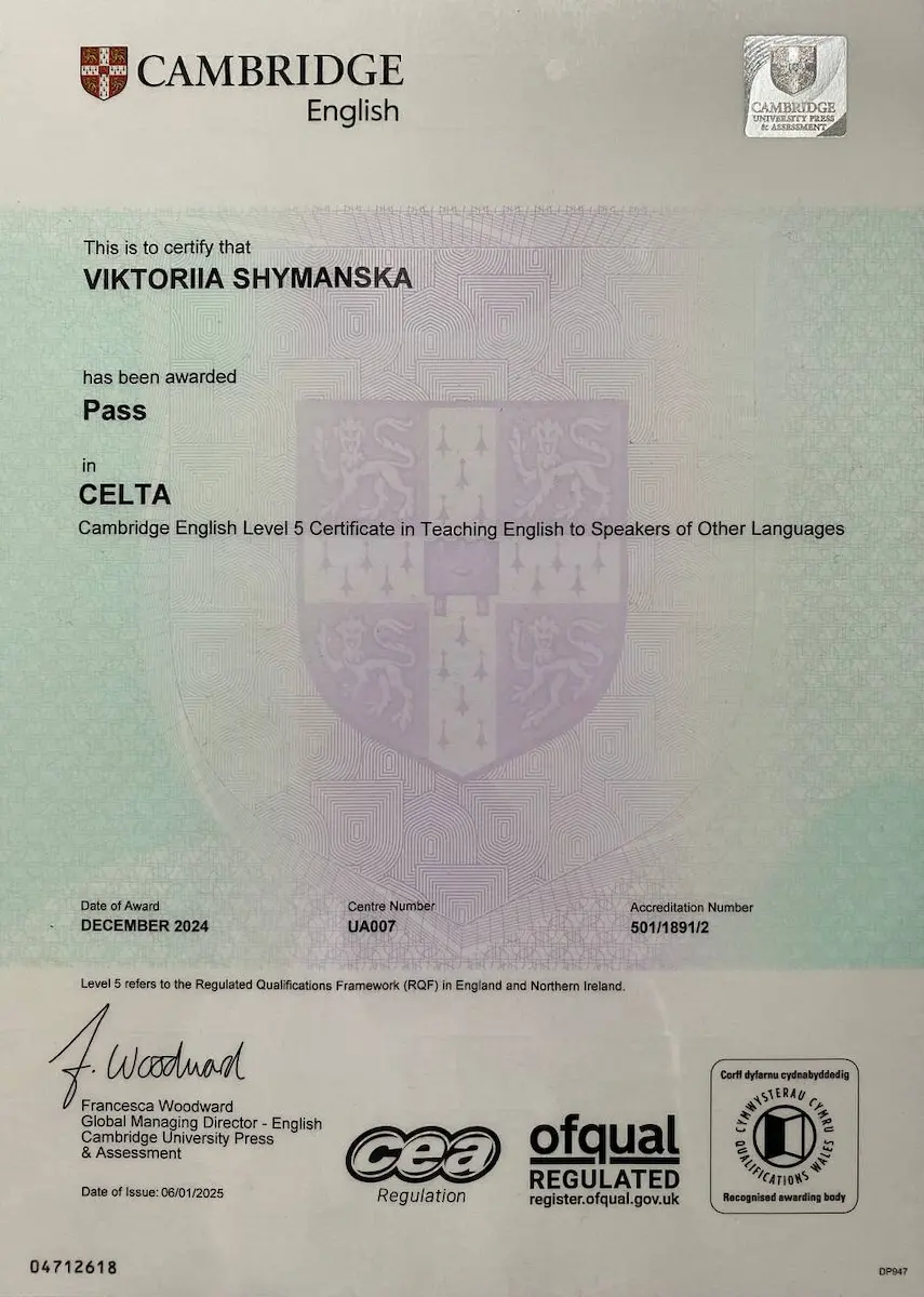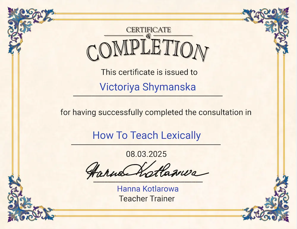 Англійська робота для мене не просто робота, а й важлива частина життя. Завдяки їй я можу читати книги та дивитися фільми в оригіналі, спілкуватися з людьми з усього світу й відкривати для себе нові культури. На своїх заняттях я прагну показати вам, які можливості відкриває англійська мова і на що ви будете здатні, опанувавши її. Крім того, я маю досвід вивчення польської та іспанської мов, а зараз активно вчу німецьку. Тож добре розумію, наскільки цей шлях може бути непростим, але водночас неймовірно цікавим.